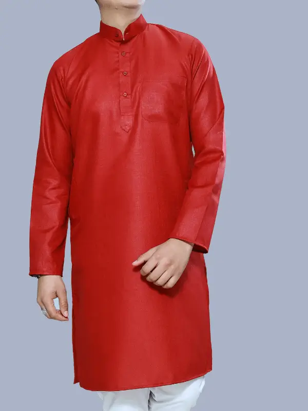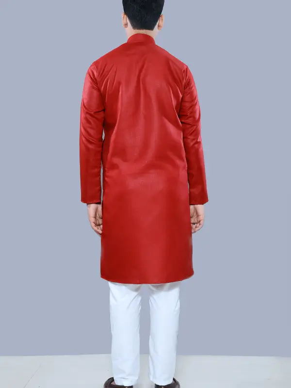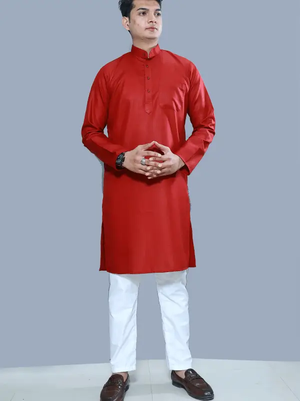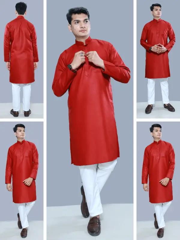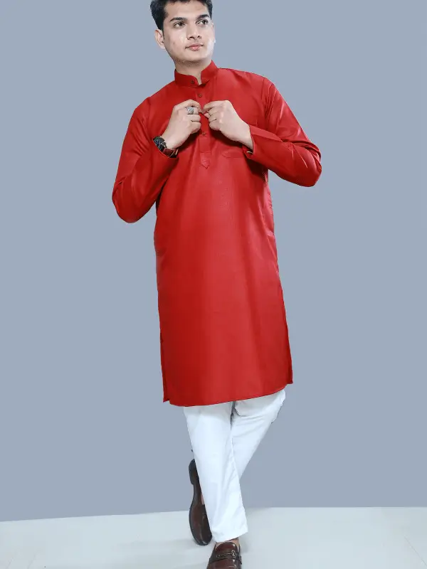 This stylish kurta pajama set features a vibrant red kurta, perfect for adding a touch of elegance to any occasion. The man wearing this kurta exudes confidence and sophistication, making it a versatile choice for both formal and casual events. Crafted with high-quality fabric, this kurta pajama set ensures comfort and durability, allowing the wearer to move with ease. Whether attending a wedding, festival, or any special gathering, this red kurta is sure to make a lasting impression.